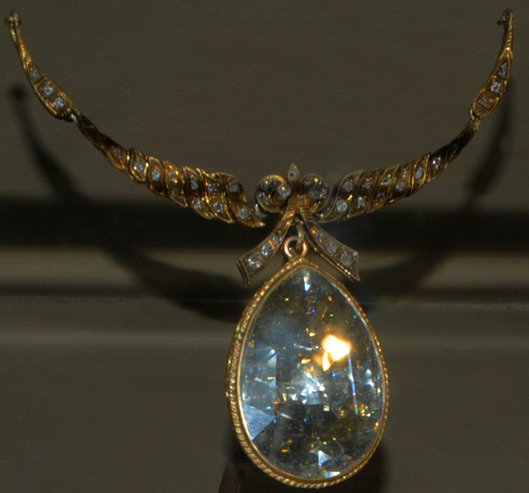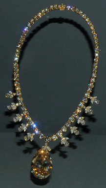 This is called the "Mystery Diamond Necklace". The mystery is not only that the origin of the necklace is unknown, but the fact that the 10-15 carat diamond looks much larger. The cleverly designed setting creates the illusion that this wafer-thin diamond is five or six times heavier than it is. It was a gift to the Smithsonian by Lillian Turner in 1998.