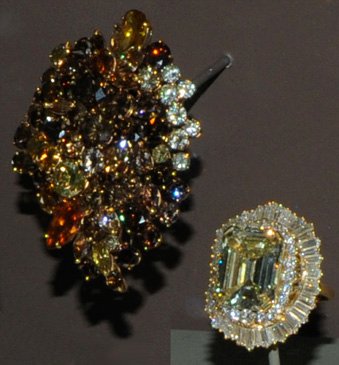 This 61.3 carat diamond brooch and the 22 carat ringdent are of unknown origin. The brooch is of 18-carat gold and contains 71 diamonds ranging in weight from 0.3 to 2.5 carats. The colors are natural. The yellow emerald-cut diamond is set in a ringdent designed to be worn as a pendant or ring.