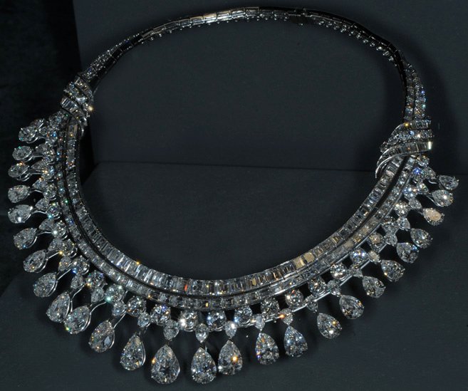 This is the Hazen Diamond Necklace. The 325 diamonds in this platinum necklace weigh a total of 131.4 carats. It was designed by Harry Winston, Inc. and a gift to the Smithsonian in 1979 by Lita Annenberg Hazen. All these diamonds are on display in the Smithsonian Museum of Natural History.