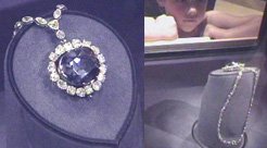 This is a larger view of the Blue Heart Diamond Ring compared to the famous Hope Diamond. It was interesting to note that the Hope Diamond is displayed unmounted in this 2010 image compared to 2003 when it was displayed in a necklace. The history of the Hope diamond may be found on the Smithsonian website. The Hope Diamond is 45.52 carats and perhaps the most famous diamond in the world. |