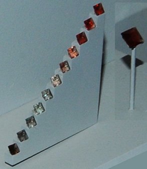 Labradorite exhibits a wide range of gem colors as shown in this display at the Smithsonian Museum of Natural History. The larger gem is 3.2 carats and the collection of smaller gems are 1.7 carat. They are from Oregon.