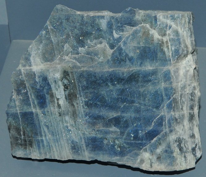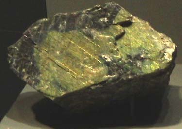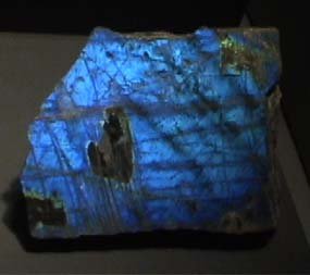Labradorite is a silicate of composition (Ca,Na)(Si,Al)4O8. These samples are on display at the Smithsonian Museum of Natural History. The sample above left is about 10x10 cm and above right is about 4x10 cm. They are displayed under ultraviolet light to show their fluorescence. These samples and the one at right below are from Nain, Newfoundland, Canada.