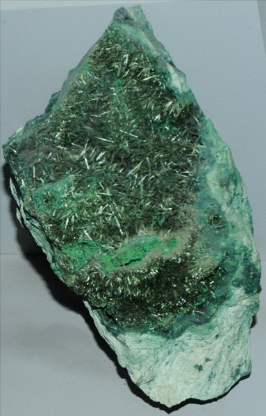 This sample of olivenite is displayed in the Smithsonian Museum of Natural History. Olivenite is an oxide mineral which contains copper and arsenic with the composition Cu2AsO4(OH). This sample is about 7x12 cm and is from Tsumeb, Namibia.