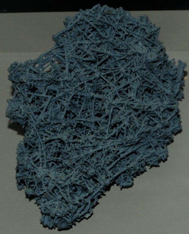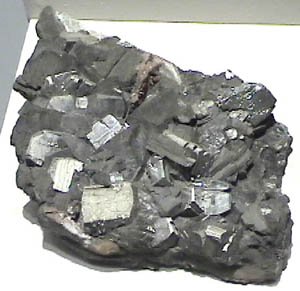These samples of pyrolusite are displayed in the Smithsonian Museum of Natural History. Pyrolusite is an oxide mineral of manganese with the composition MnO2 . This sample of pyrolusite is about 14 cm across and is from Amapa Territory, Serra do Navio, Brazil.