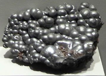 This sample of romanechite is displayed in the Smithsonian Museum of Natural History. Romanechite is an oxide of barium and manganese with the composition (Ba, H2O)2Mn5O10 . This sample is about 9x7 cm and is from Marquette County, Michigan.