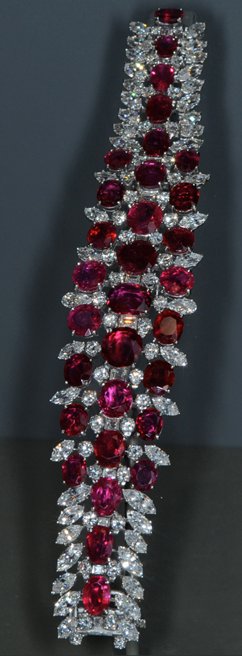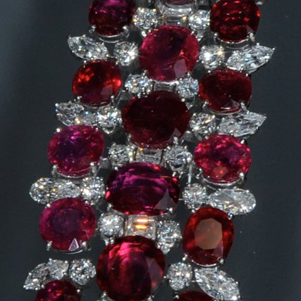 These are man-made or "cultured" rubies. All the samples are on display at the Museum of Natural History. Ruby is made up of the mineral corundum, which is aluminum oxide (alumina, Al2O3). It becomes the precious stone when it has a a small impurity of chromic oxide which gives it the rich red color. If the corundum has other impurities to give it other colors, it is called sapphire.