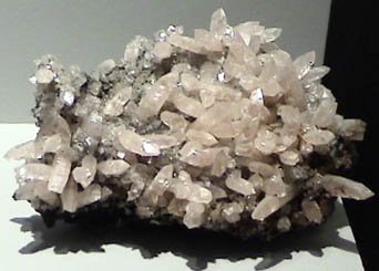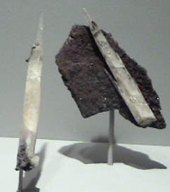 The colors of the zinc carbonate mineral range through the spectrum from green to pink. The pink sample above is about 13x13 cm in size, wheras the slender white spears at right are around a half centimeter in diameter.