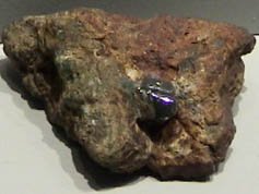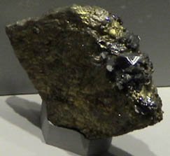 These samples of sperrylite are displayed in the Smithsonian Museum of Natural History. Sperrylite is a compound of platinum and arsenic with the composition PtAs2. The sample at left is about 6x9 cm and is from Pottgietersrust, Transvaal, South Africa. The one at right is about 5x6 cm and is from Talnach deposit, Noril'sk, Krasnoyarskiy Kray, Russia. The one at right also contains chalcopyrite and pentlandite.