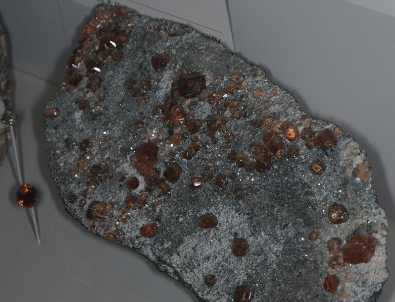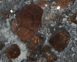 Spessartine is silicate of manganese and aluminum with the composition Mn3Al2(SiO4)3. This sample is about 3x3 cm and is from Gilgit, Northern Areas, Pakistan. These samples are displayed in the Smithsonian Museum of Natural History.
