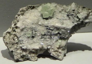 This sample of sphalerite is displayed in the Smithsonian Museum of Natural History. Sphalerite is an sulfide mineral of zinc with the composition ZnS. This sample is about 12X12 cm and is from Nenthead district, Cumbria, England. Sphalerite is the most common ore of zinc. It has been called blende and zinc blende.