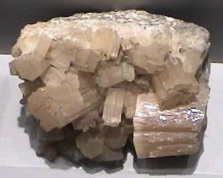 Strontianite is a carbonate mineral of strontium. It has the composition SrCO3. The origin of this sample is Drensteinfurt, Nord, Rhein-Westphalen, Germany. The sample measures about 9 cm across. All these samples are on display in the Smithsonian Museum of Natural History.