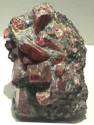 Chondrodite is a silicate with the composition (Mg,Fe)5(SiO4)2(F,OH)2. This sample is about 7x9 cm and is from Tilly Foster mine, Brewster, New York. The red crystals are about a cm in size.