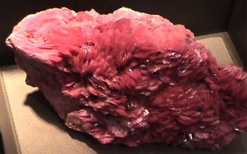 This sample of rhodonite is on display at the Smithsonian Museum of Natural History. The sample size is about 15x9 cm.