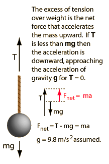 Lifting MassThough a straightforward application of Newton's second law, many find this problem deceptive. The common misconception which is carried into it is that the tension in the rope must equal the weight of the hanging object. When the mass is accelerated, that is not so. You may change the data and then click on either tension or acceleration in the equation below to calculate its value. mass x acceleration = tension - weight
