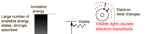 Visible Light InteractionsThe primary mechanism for the absorption of visible light photons is the elevation of electrons to higher energy levels. There are many available states, so visible light is absorbed strongly. With a strong light source, red light can be transmitted through the hand or a fold of skin, showing that the red end of the spectrum is not absorbed as strongly as the violet end.![]() While exposure to visible light causes heating, it does not cause ionization with its risks. You may be heated by the sun through a car windshield, but you will not be sunburned - that is an effect of the higher frequency uv part of sunlight which is blocked by the glass of the windshield. Interaction of radiation with matter |