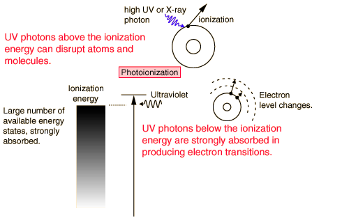 Ultraviolet Interactions![]() The near ultraviolet is absorbed very strongly in the surface layer of the skin by electron transitions. As you go to higher energies, the ionization energies for many molecules are reached and the more dangerous photoionization processes take place. Sunburn is primarily an effect of uv, and ionization produces the risk of skin cancer. The ozone layer in the upper atmosphere is important for human health because it absorbs most of the harmful ultraviolet radiation from the sun before it reaches the surface. The higher frequencies in the ultraviolet are ionizing radiation and can produce harmful physiological effects ranging from sunburn to skin cancer. Health concerns for UV exposure are mostly for the range 290-330 nm in wavelength, the range called UVB. According to Scotto, et al, the most effective biological wavelength for producing skin burns is 297 nm. Their research indicates that the biological effects increase logarithmically within the UVB range, with 330 nm being only 0.1% as effective as 297 nm for biological effects. So it is clearly important to control exposure to UVB. Interaction of radiation with matter |