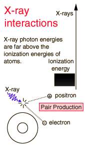 ![]() You may click on any of the types of radiation for more detail about its particular type of interaction with matter. The different parts of the electromagnetic spectrum have very different effects upon interaction with matter. Starting with low frequency radio waves, the human body is quite transparent. (You can listen to your portable radio inside your home since the waves pass freely through the walls of your house and even through the person beside you!) As you move upward through microwaves and infrared to visible light, you absorb more and more strongly. In the lower ultraviolet range, all the uv from the sun is absorbed in a thin outer layer of your skin. As you move further up into the x-ray region of the spectrum, you become transparent again, because most of the mechanisms for absorption are gone. You then absorb only a small fraction of the radiation, but that absorption involves the more violent ionization events. Each portion of the electromagnetic spectrum has quantum energies appropriate for the excitation of certain types of physical processes. The energy levels for all physical processes at the atomic and molecular levels are quantized, and if there are no available quantized energy levels with spacings which match the quantum energy of the incident radiation, then the material will be transparent to that radiation, and it will pass through. Electromagnetic spectrum annotated with physiological effects |