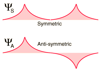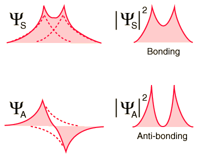 As shown below, when the hydrogen atoms are brought close together the symmetric spatial wavefunction leads to a bonding configuration of electrons and the antisymmetric one does not. The actual electron charge density is given by the square of the magnitude of the wavefunction, and it can be seen that the symmetric wavefunction gives a high electron density between the nuclei, leading to a net attractive force between the atoms (a bond).
