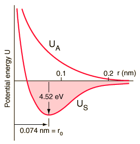 The exchange interaction (an entirely quantum mechanical effect) leads to a strong bond for the hydrogen molecule with dissociation energy 4.52 eV at a separation of 0.074 nm. The potential energy of the anti-bonding orbital shown gives some insight into why a third hydrogen atom cannot bond to the two atoms of the hydrogen molecule. It would be in an anti-bonding situation with one of the other hydrogen atoms and would therefore be repelled. We say that the bond in the hydrogen molecule is "saturated" because it cannot accept another bond.