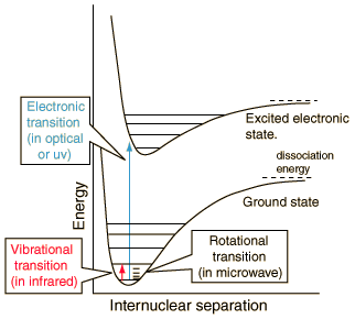 | The most commonly observed molecular spectra involve electronic, vibrational, or rotational transitions. For a diatomic molecule, the electronic states can be represented by plots of potential energy as a function of internuclear distance. Electronic transitions are vertical or almost vertical lines on such a plot since the electronic transition occurs so rapidly that the internuclear distance can't change much in the process. Vibrational transitions occur between different vibrational levels of the same electronic state. Rotational transitions occur mostly between rotational levels of the same vibrational state, although there are many examples of combination vibration-rotation transitions for light molecules. |