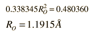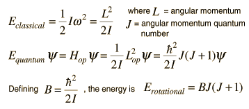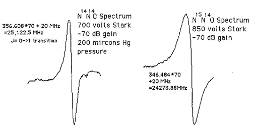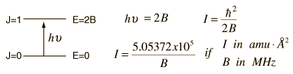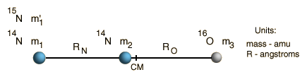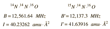 Rotational Spectra and Structure of a Linear MoleculeThe frequencies of microwave absorption transitions can be used to calculate molecular structure parameters. The structure of nitrous oxide is one which can be readily calculated from the measurement of molecular rotational spectra. The structure of this linear molecule involves only two parameters RN and RO as illustrated. ![]() The rotational energy of the molecule is given by ![]() The J=0 to J=1 transition of NNO can be measured to determine the moment of inertia I of the molecule. ![]() But if only one moment of inertia is measured, there is not sufficient data to calculate the structure since it involves two unknown parameters. If the isotope 15N is substituted at position m1, then another moment of inertia is determined and the two structural parameters can be determined. This strategy of isotopic substitution to gain structural information is a common one, depending upon the fact that the structure of the molecule is determined by the electric properties of the atoms and unaffected by substitution of a different isotope. The moment of inertia in terms of the molecular bond lengths RN and RO is ![]() where M is the total mass of the molecule. The moments of inertia of the two isotopic species can be obtained from the following spectral measurements. ![]()