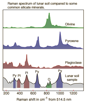 | The illustration at left shows qualitative sketches of Raman spectra displayed by the Department of Earth and Planetary Sciences, Washington University in St. Louis ( This research group is developing Raman spectrometers for in situ analysis of minerals on planetary surfaces. The spectra are attributed to Wang et al., J. Geophys. Res. 100, p21189-21199 (1995). Spectra of the common silicate minerals olivine, pyroxene, and plagioclase are compared to a Raman spectrum of a lunar soil sample identified as 71501.