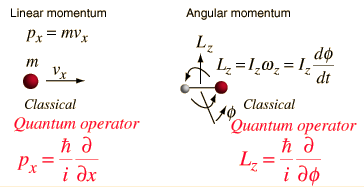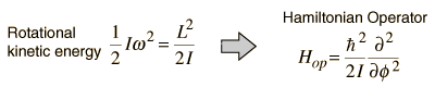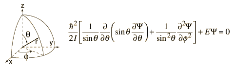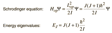 Energy Calculation for Rigid Rotor MoleculesIn many cases the molecular rotation spectra of molecules can be described successfully with the assumption that they rotate as rigid rotors. In these cases the energies can be modeled in a manner parallel to the classical description of the rotational kinetic energy of a rigid object. From these descriptions, structural information can be obtained (bond lengths and angles). The most straightforward examples are those of diatomic molecules. Energy calculations in quantum mechanics involve the solution of the Schrodinger equation with a properly formulated Hamiltonian to represent the energy operator. The form of the Hamiltonian can often be implied from the nature of the classical energy of such a physical system. The process involves finding the quantum mechanical operators associated with the constituents of the system energy. The energy of a freely rotating rigid rotor is simply the rotational kinetic energy, which can be expressed in terms of the angular momentum. The general form of operators associated with momenta are: ![]() Since the rotational kinetic energy of the rigid rotor can be expressed in terms of the angular momentum, we can imply the form for the Hamiltonian associated with the rotation around a single principal axis. ![]() For this limited case of rotation about a single axis, the Schrodinger equation can be formulated in terms of the total angular momentum and the form of the energy eigenvalues implied. ![]() To treat the more general three-dimensional rotation of a rigid molecule, it is necessary to formulate the Hamiltonian in three dimensions. It is appropriate to formulate it in spherical polar coordinates, and this adds significantly to the mathematical complexity. The square of the angular momentum operator takes the form of a Laplacian and the Schrodinger equation takes the form ![]() This form of the angular momentum contribution is also encountered in the solution of the Schrodinger equation for the hydrogen atom. The approach to the solution of this differential equation is to separate the variables in the form ![]() Substitution into the Schrodinger equation gives the two separated equations ![]() where M is inserted as an arbitrary "separation constant" at this point, but will be found to represent MJ, the z-component of the angular momentum. Solutions to these equations which meet the necessary constraints on the wavefunction, i.e. single valued and normalizable, can be obtained only when ![]() where J is a positive integer and M is an integer such that the absolute value of M is less than or equal to J. The wavefunctions associated with these allowed solutions are ![]()