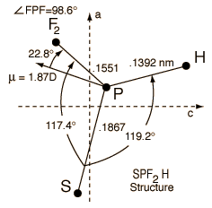 For a general molecule there are three non-equivalent moments of inertia and the kinetic energy expression becomes ![]() and the energies are expressed in terms of three rotational constants A, B and C. ![]() The complexity of the energy expressions is bad news in terms of the difficulty of analysis, but good news in terms of the information obtained. The structure of a diatomic molecule has only one unknown, but when you have multiple bond lengths and angles, you have several unknowns and need several equations to solve for them. To determine the structure of SPF2H, you have to determine three angles and three bond lengths, so you need six equations. Rotation about three non-equivalent axes gives you three. So how do you determine the structure? The physical idea which rescues you from the dilemma of insufficient data is isotopic substitution. Since the bond lengths are determined by the electrostatic force, substituting a different isotope into the atom should not change the bond lengths since the electrical environment around the isotope is identical. However, the moments of inertia will be changed, giving you three more pieces of data in the form of the new rotational constants A', B', and C'. While doing the experiment on SPF2H, which has six structural parameters, it appeared that producing the molecule with deuterium substituted for normal hydrogen would be sufficient for structure determination since that would give you 6 parameters. We were working in a laboratory at the University College of North Wales in Bangor, Wales on a sample prepared by R. G. Cavell of the Department of Chemistry, Edmonton, Alberta. This was within months of the first time that compound had ever been synthesized; we had read of his initial synthesis. We contacted him and he graciously agreed to synthesize the molecule with deuterium substituted for hydrogen. The molecule is quite unstable and explosive on contact with air, so we treated the deuterated sample with great care and took data on its spectrum for about two weeks. Unfortunately, one night the glass vacuum system developed a leak and we came in the next morning to find it had exploded and we had lost both the sample and the vacuum system. At least we had two weeks of spectra and had enough data to determine the rotational constants. Unfortunately, our consolation about having collected just enough data to determine the parameters of the deuterated species of the molecule was short-lived as we faced yet another hurdle to the determination of the molecular structure. Six pieces of data were not enough to determine the structure of this molecule! There is a plane of symmetry in this molecule, the two fluorines being at mirror image sites on each side of the plane formed by the SPH framework. This meant that once the two moments of inertia in the SPH plane were determined, the third moment of inertia was determined by the perpendicular axis theorem and not independent of the other two moments of inertia. Six independent pieces of data were required to calculate the structure unambiguously, and now we had only four. We were rescued in this effort by the fact that the spectrum of SPF2H was extremely strong and well resolved and we could in fact collect data for a third isotopic species, the species with sulfur-34. It has a natural abundance of 3% and this turned out to be enough to detect it. We knew where to look because we could make a fairly accurate model from the normal and deuterated sample data, and we still had the original sample. Solving for moments of inertia from our model, we predicted the locations of a dozen or so critical lines and looked for them at high resolution. The third set of rotational constants A",B", and C" gave us the needed data to calculate the structure shown.