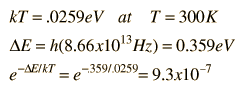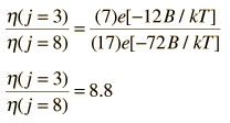 Relative Intensity for HCl LinesDetermining the relative intensities of spectral lines is an important part of the analysis of spectra. Examination of the experimental HCl spectrum shows a characteristic variation of intensity with the j value for the transition. At first glance, it would appear that the peak intensities should scale with the relative population of the lower state in the transition. The population of the upper vibrational state is very low at room temperature, as indicated by the following analysis: ![]() If we use only the lower state population as an index and compare the j=3, v=0 state to the j=8,v=0 state, the relative population should be ![]() But the measured relative peak height on the HCl spectrum for the j=3 and j=8 peaks is only about 2.3 . Not knowing the nature of the spectrum detection, one could look at the relative intensities of the Cl-35 and Cl-37 peaks, which should have a 3:1 ratio of intensity based on the 3:1 abundance ratio for those isotopes. The Cl-35 peaks scale only about 1.3 times the Cl-37 peaks. |