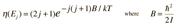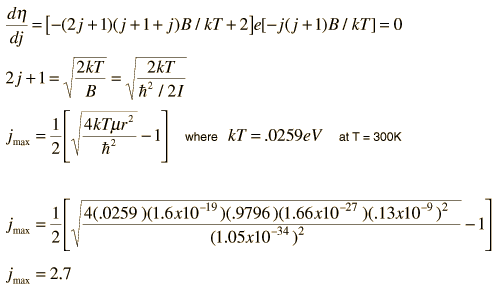 Peak Intensity for HCl SpectrumNote that the spectral lines closest to the center of the HCl spectrum are not the strongest transitions. The intensity goes through a maximum and then drops off for higher values of rotational angular momentum j. The condition for maximum intensity is that the number of molecules which will occupy the lower state of the transition is a maximum. Since for a given value of j there are 2j+1 states of the same energy (degenerate states), the higher j states have a statistical advantage. However, higher energy state population is reduced by the Boltzmann factor so that the net population for a given rotational state is given by: ![]() The value of j associated with the highest population can be determined by taking the derivative of the population with respect to j. This gives ![]() So the lower states with j=2 and 3 are those which are expected to give the highest intensities, and that is borne out by the experimental spectrum. |