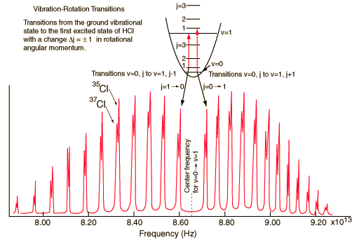 Vibration-Rotation Spectrum of HCl![]() A classic among molecular spectra, the infrared absorption spectrum of HCl can be analyzed to gain information about both rotation and vibration of the molecule. The absorption lines shown involve transitions from the ground to first excited vibrational state of HCl, but also involve changes in the rotational state. The rotational angular momentum changes by 1 during such transitions. If you had a transition from j=0 in the ground vibrational state to j=0 in the first excited state, it would produce a line at the vibrational transition energy. As observed, you get a closely spaced series of lines going upward and downward from that vibrational level difference. The splitting of the lines shows the difference in rotational inertia of the two chlorine isotopes Cl-35(75.5%) and Cl-37(24.5%). From the spectrum above, you can examine details about the following:
