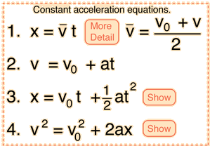 Comments on Motion ExplorerIn the example motion calculation, some assumptions are made about the calculation order. It is intended to be an exploration exercise, and may not conveniently solve all problems. The motion equations represent a complete set of equations for constant acceleration motion, but in certain types of problems, intermediate results must be calculated before proceeding to the final calculation. In the example calculation, you may have to do intermediate calculations, e.g., to establish the final velocity, in order to set up the problem you wish to solve, just as if you were working the problem with calculator and paper. In the example calculation, the time, initial velocity, and displacement were considered given (primary) unless they were being calculated . For example,if x is being calculated, then v is assumed given, so it must be calculated first if you want to specify a. After making substitutions, not all values are updated, so to be sure a specific parameter has been updated, click on the text or symbol associated with that parameter. |