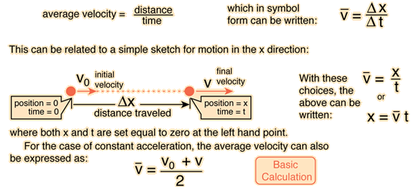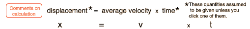 Distance, Average Velocity and TimeThe case of motion in one dimension (one direction) is a good starting point for the description of motion. A basic type of calculation may be explored here by substituting numbers and then clicking on the bold text of the quantity you wish to calculate. Make only one substitution at a time and click the desired quantity -- then you can repeat with other substitutions.![]()