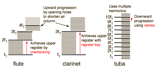 Air Column RegistersThe playing range of woodwind instruments is extended by the existence of upper registers which allow them to excite upper harmonics of the air columns. In the flute the process is called overblowing. The upper register is an octave up in such instruments since they act as open-ended cylinders. Other woodwinds achieve their upper register with the use of a register key which destroys the lowest mode of vibration of the air column and forces the column to vibrate at its next highest harmonic. For the clarinet this upper register is the third harmonic, but for the other woodwinds, it is an octave up because they are conical air columns.