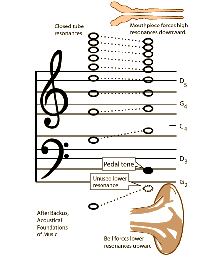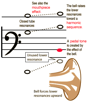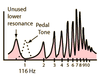 The Pedal ToneThe pedal tone is a unique characteristic of brass instruments. It is the note which is at the fundamental frequency of the harmonic sequence of the instrument, but it is not a resonant frequency of the air column. When the bell effect raises the lower resonances of the closed tube, the lowest resonance is actually not used, being out of tune with the rest of the notes. However, if the player's lips are vibrated at the pedal tone frequency, all the harmonics above it contribute and produce a tone at this pedal tone pitch. It is sometimes called a fictitious fundamental, but for the bass brass instruments, it is quite strong and useful.