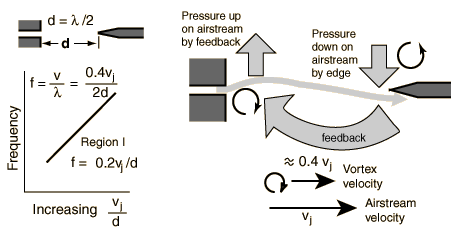 Feedback and EdgetonesThe undulations of the airstream, traveling at about 0.4 times the speed of the jet, cause the airstream to dip below the edge. Interaction with the edge causes an increase in pressure, which feeds back to the slit area, tending to force the airstream upward. When this upward deflection reaches the edge, its feedback forces the stream downward at the slit. This positive feedback reinforces an edgetone frequency for which the slit-to-edge distance is a half wavelength, so this frequency will build up and maintain reasonable stability. ![]() The airstream dips below edge, shedding its vortex. Pressure down on airstream causes feedback to slit area where it tends to push the airstream up.