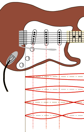 The Fender StratocasterA solid-bodied electric guitar, the Fender Stratocaster has steel strings and three magnetic pickups, the back, middle and front pickups. The back pickup, situated closest to the bridge, has an offset angle of about ten degrees towards the fingerboard underneath the lower strings to give them more fundamental content. Its treble pole angles toward the bridge to give those strings more high harmonic content. This gives a gradual brightening of tone across the strings from bass to treble. The Stratocaster has a switch that operates these pickups as individuals or in combination. This guitar is noted for its high pitched screams produced by the shape of the body and the single coil pickups. |