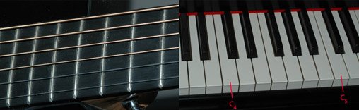 The piano keyboard is the standard example of the equal tempered scale, and the frets on a modern guitar are also placed to fix the instrument into the equal tempered scale.