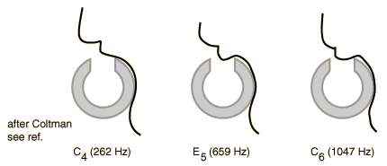Flute ConstructionThe modern flute is about 26 inches in length with and inside diameter of about 3/4", open at one end . The embouchure at which the edgetone is produced is near one end and constitutes a second open end, making the flute an open cylinder in harmonic content. As with other edgetone instruments, the tone production is made more efficient by the coupling of the slit formed by the players lips, the edge, and the air column. The flute has a series of 16 openings in the tube wall, 11 of which can be closed directly by seven fingers and one by the left thumb. The four additional openings can be opened or closed by means of suitably arranged keys. One advantage of the flute over the recorder is that the player has direct control over the angle at which the air from the lips strikes the embouchure hole. Rolling in or out with the lips relative to the edge gives the player a greater range of volume and expression, and aids the process of overblowing to achieve the higher register. This direct access to the edge also permits the player to make small fine tuning adjustments.