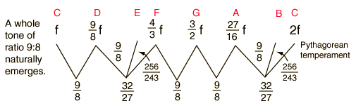 Pythagorean TemperamentA pentatonic musical scale can be devised with the use of only the octave, fifth and fourth. It produces three intervals with ratio 9/8 and two larger intervals. If a 9/8 (whole tone) interval is carved out of the larger ones, a smaller (semitone) interval is left: B-C and E-F. This creates a Pythagorean diatonic scale. If the semitone thus created is taken from the whole tone, a chromatic semitone of different size is left over. This leads to some of the difficulties of Pythagorean temperament and other temperaments - such difficulties ultimately led to the development of equal temperament. ![]()
