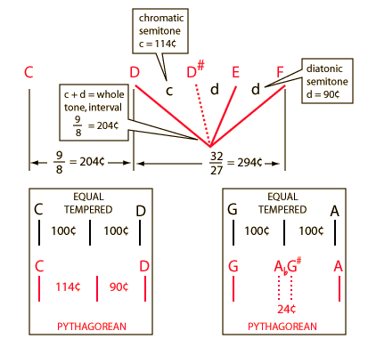 Pythagorean IntervalsThe Pythagorean temperament produces two different semitones. When expressed in cents, it becomes evident that their differences are well above the just noticeable difference in pitch. ![]() This leads to certain difficulties which ultimately led to the development of equal temperament.
