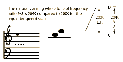The Whole ToneIn the buildup of a pentatonic scale using the musical intervals which have been found to be universally consonant ( octave, fifth, and fourth), an interval of ratio 9/8 naturally emerges. This interval satisfies the basic condition for consonance and it occurs in the basic pentatonic scale. This suggests the carving of another such whole tone from the larger interval remaining, leaving the smaller 256/243 interval. This whole tone is used in the Just and Pythagorean temperaments. In devising the equal tempered scale it was important to maintain not only the octave, fifth, and fourth at close to their just values, but also to maintain the whole tone. Expressed in cents notation, the natural whole tone is 204¢, compared to 200¢ for the equal tempered whole tone, just within the accepted 5¢ just noticeable difference. ![]() ![]() |