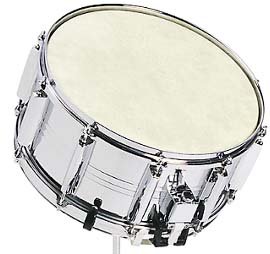 The snare drum is a two-headed drum, as is the bass drum and other orchestral and band drums used in Western music. On the snare drum, eight to ten wire-bound gut strings, or snares, usually are stretched across the lower of the two heads; they vibrate against the heads as the membranes are struck. The two membranes of the snare drum are acoustically coupled to each other, particularly at the low frequencies. This coupling via the enclosed air acts to double the modes. The lower frequency member of the mode pair involves both heads moving in the same direction and for the higher mode they move oppositely. |