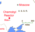 Chernobyl Radioactive Contamination Cloud![]() This is a depiction of the contamination cloud roughly following that reported by Time Magazine on May 12, 1986. Some of the first reports of radioactivity came from Finland since the U.S.S.R. was silent about the accident until after it had been detected by its neighbors to the north. With time, some detectable radiation spread throughout the world. |