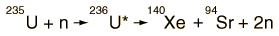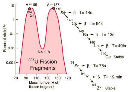 | Cesium-137 decay has a half-life of 30.07 years and proceeds by both beta decay and gamma emission from an intermediate state. Both the electron and gamma emissions are highly ionizing radiation. The gamma radiation is very penetrating, and the beta radiation, though very short range, is very dangerous when ingested because it deposits all that energy in a very short distance in tissue. |  |