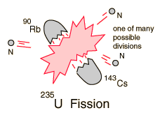 Nuclear FissionIf a massive nucleus like uranium-235 breaks apart (fissions), then there will be a net yield of energy because the sum of the masses of the fragments will be less than the mass of the uranium nucleus. If the mass of the fragments is equal to or greater than that of iron at the peak of the binding energy curve, then the nuclear particles will be more tightly bound than they were in the uranium nucleus, and that decrease in mass comes off in the form of energy according to the Einstein equation. For elements lighter than iron, fusion will yield energy. The fission of U-235 in reactors is triggered by the absorption of a low energy neutron, often termed a "slow neutron" or a "thermal neutron". Other fissionable isotopes which can be induced to fission by slow neutrons are plutonium-239, uranium-233, and thorium-232. ![]()