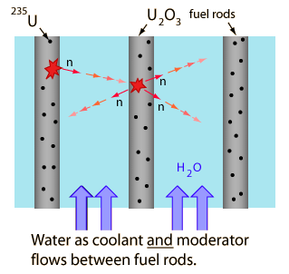 Light Water ReactorsThe nuclear fission reactors used in the United States for electric power production are classified as "light water reactors" in contrast to the "heavy water reactors" used in Canada. Light water (ordinary water) is used as the moderator in U.S. reactors as well as the cooling agent and the means by which heat is removed to produce steam for turning the turbines of the electric generators. The use of ordinary water makes it necessary to do a certain amount of enrichment of the uranium fuel before the necessary criticality of the reactor can be maintained.