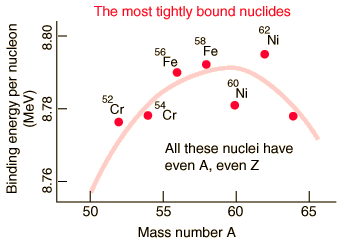 The most tightly bound nuclides are all even-even nuclei. The curve drawn through the cluster of nuclei above is just to show the nature of the trend with mass number. A similar kind of trend is observed with even-odd nuclides at a lower range of binding energy, and then by odd-odd nuclei at the least-bound extreme. The peaks of all three groups occur around A = 60. The high binding energy of this group of elements around A=60, typically called "the iron group" by astrophysicists, is significant in the understanding of the synthesis of heavy elements in the stars. It is curious that the abundance of 56Fe is an order of magnitude higher than that of 62Ni. Fewell discusses this point, and indicates that the reason lies with the greater photodisintegration rate for 62Ni in stellar interiors.