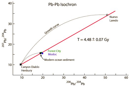 The above diagram from Patterson represented a major breakthrough in the use of lead isochrons when it was published in 1956. It presented the analysis of three stony meteorites and two iron meteorites and showed that they fell on the same isochron. In addition, it showed that a sample of modern ocean sediment fell on the same isochron. Besides offering confirmation of the meteorite age that had been approached in many studies, it offered evidence that meteorites and the Earth are closely related and of the same age. Like most modern lead age studies, it used the troilite mineral from the Canyon Diablo meteorite as the standard. The isochron age was reported by Patterson as 4.55 Gy, but that becomes 4.48 Gy with the application of the revised decay constants for the isotopes involved.