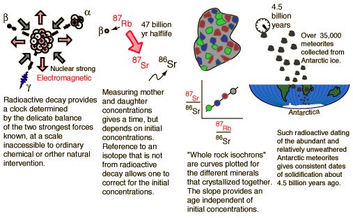 If you had 100% pure parent element when you began a dating process, then radioactive dating would be extremely reliable since the radioactive half-life of a given isotope is quite independent of any natural forces save direct collision-type interactions with the nucleus. Considering the relative scale of nuclei and atoms, nuclei are so remote from the outer edge of the atoms that no environmental factors affect them. However, there are two obvious problems with radioactive dating for geological purposes: 1) uncertainty about the composition of the original sample and 2) possible losses of material during the time span of the decay. The rubidium/strontium dating method deals with both of those difficulties by using the non-radioactive isotope strontium-86 as a comparison standard. The relative amounts of strontium-87 and -86 are determined with great precision and the fact that the data fits a straight line is a strong argument that none of the constituents was lost from the mix during the aging process. The 4.5 billion year age for the earth is consistent with the results of the potassium/argon and uranium/lead processes. Similar results are also obtained from the study of spontaneous fission events from uranium-238 and plutonium-244. One of the standard